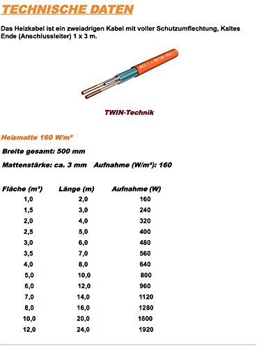 ECOFLOOR® Fußbodenheizung elektrisch 160 Watt/m² Größe wählbar 1- 12m² Fußboden-Heizmatte Twin (1.5 m² = 3m Länge)Description : Fenix ECOFLOOR® Fußbodenheizung - 160 W/m² für Steinböden
